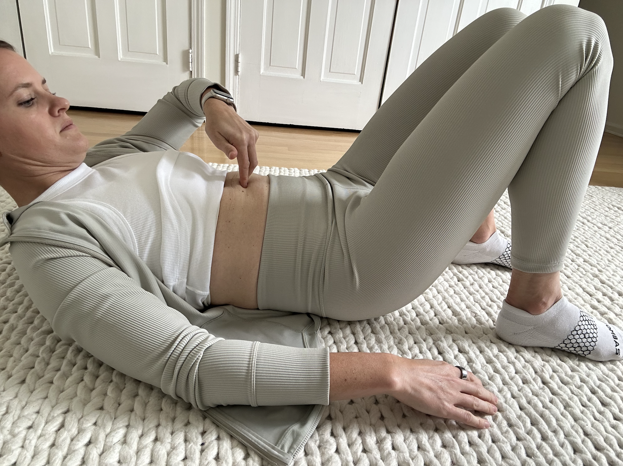 Lie on your back on the floor with your knees bent, feet on the floor: Place one or two fingers horizontally at the midline of your abdomen. You can start about 2 inches above your belly button.